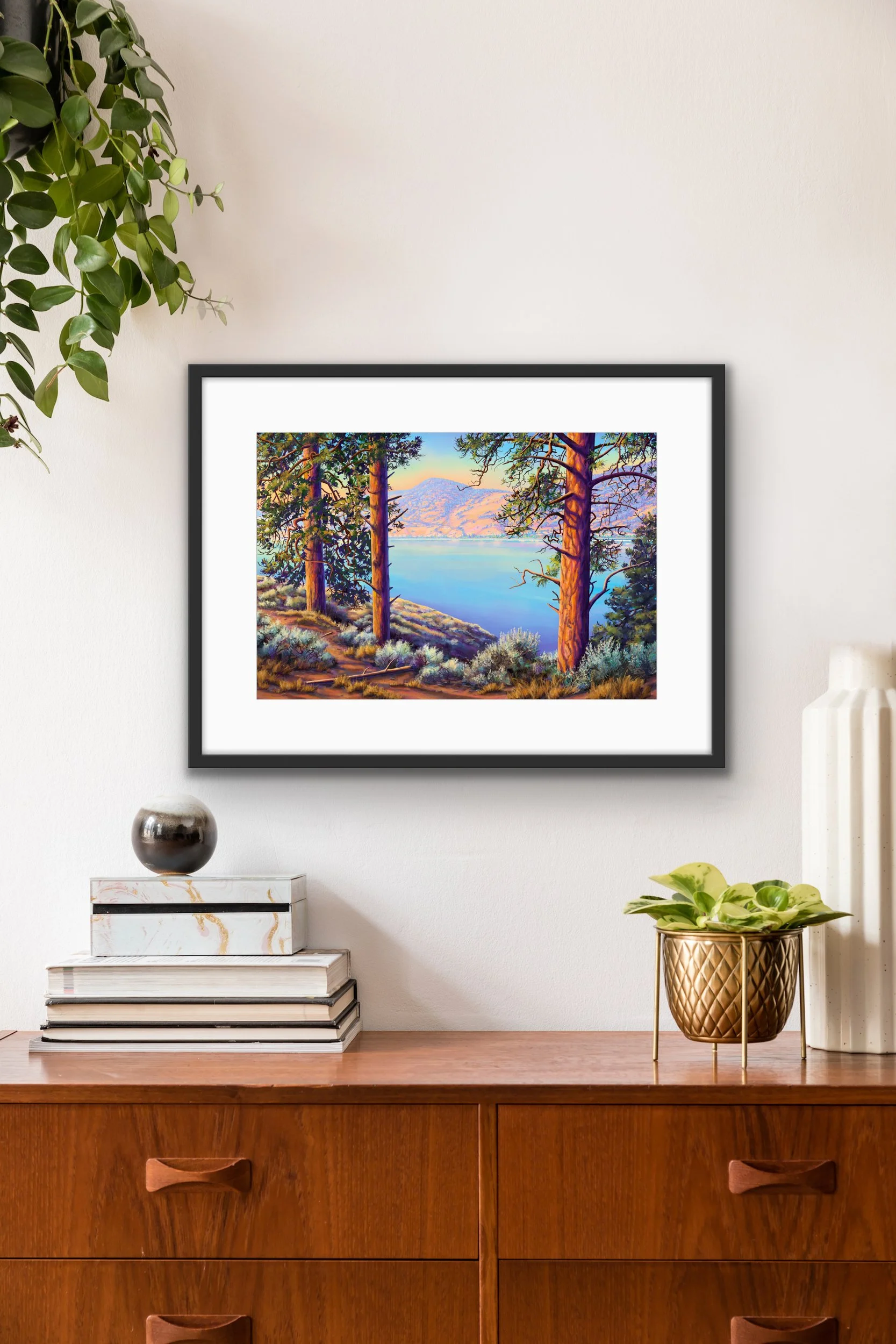 One of Jaxon’s favourite places on the lake, Commando Bay is rich in local history. Located near the mouth of Wild Horse Canyon, local Indigenous peoples once used the rocky topography of this area as a wild horse trap prior to early settlers using it as a trail to access Father Pandosy’s Mission (which later became Kelowna). As the road network through the Valley moved to the west side of the Lake, these isolated slopes became the perfect spot to conduct secret military ops. During WWII, British Intelligence relied on a select group of Chinese Canadian volunteers for a very dangerous special military operation behind enemy lines in South East Asia. After months of training, many of these soldiers underwent further parachute training in Australia before deployment in Borneo where a number were awarded Military Medals for their courage and bravery! Due to it’s top secret history, this area became known as “Commando Bay”. Now part of Okanagan Mountain Provincial Park, it is an iconic camping spot that is only accessible by boat or hiking trail! A fabulous 25 km out-and-back trail run from the end of Lakeshore Road, Jaxon’s favourite part of this area is spotting the Big Horn Mountain Sheep that hang out on the rocky cliffs above the Lake. An arid environment filled with sage brush, ponderosa’s & the odd rattlesnake, Jaxon looks to bring a warm summer feeling into your home with a vibrant creation that is rich with local history!